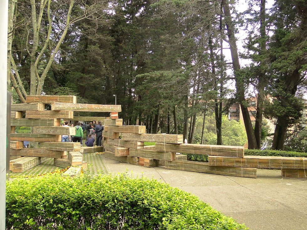 Para la construcción utilizamos casetones de guadua y madera, además nos integramos con la Facultad de Artes Visuales, quienes nos donaron algunos de sus trabajos dándole mayor dinamismo.